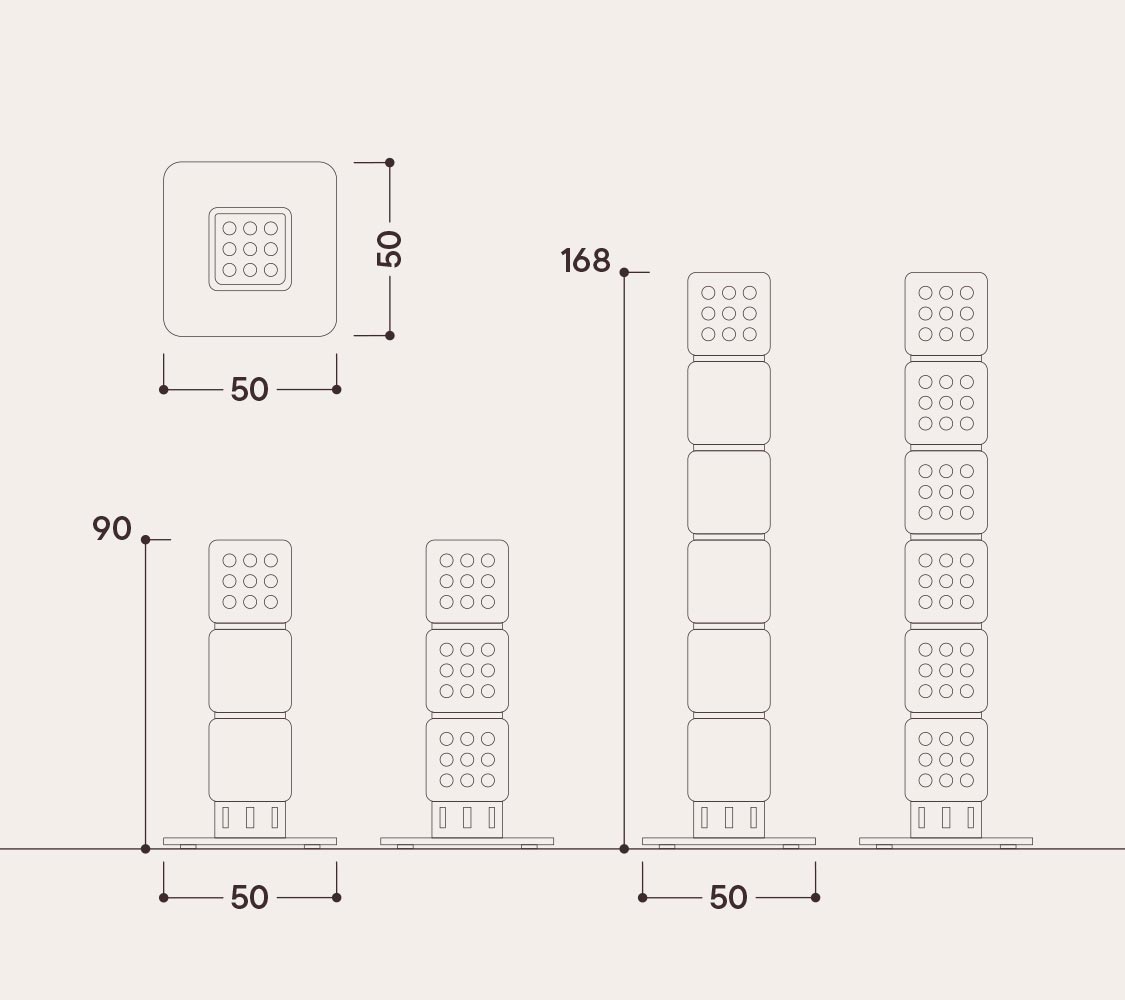 L’altezza di tutti e due i modelli è di 128cm e le misure della base variano a seconda del modello scelto, come indicato nel disegno sottostante ed a catalogo.